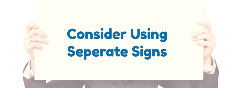 When using separate signs, it can be a good idea to create cohesion with the same color scheme. Usually, the color scheme on real estate signs matches the color of the real estate company. However, one color could be highlighted over another depending on the area or neighborhood. Understated signs may be best for high-end neighborhoods, while bold signs will help a sign stand out in more affordable neighborhoods, especially if the market is saturated in that area. A unique color scheme is also more easily spotted over traditional real estate color schemes.